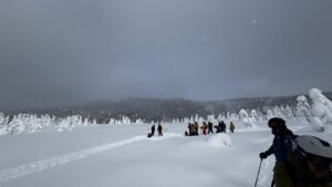 たいして歩いてないけども、だいぶ雪が深くてガイドさんたちは年長者の多いツアーだからこその緩やかなルート作りに苦戦してた。